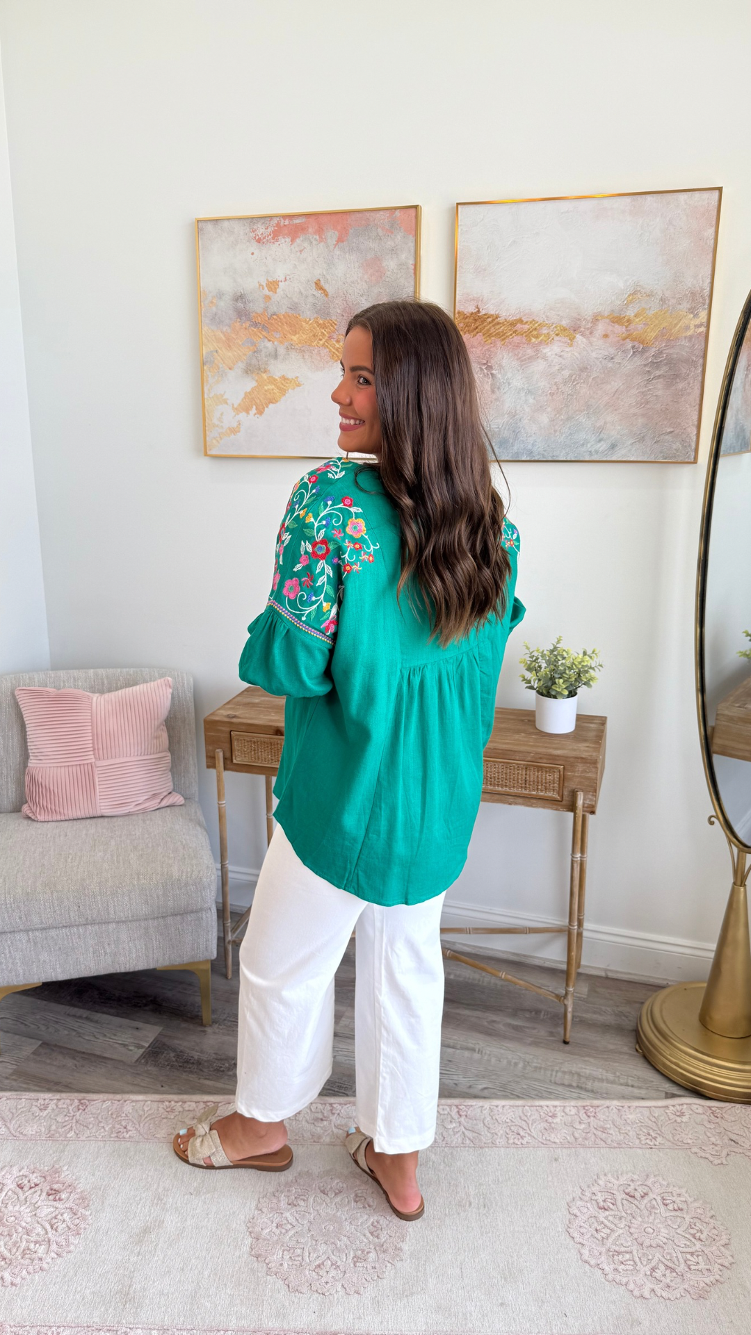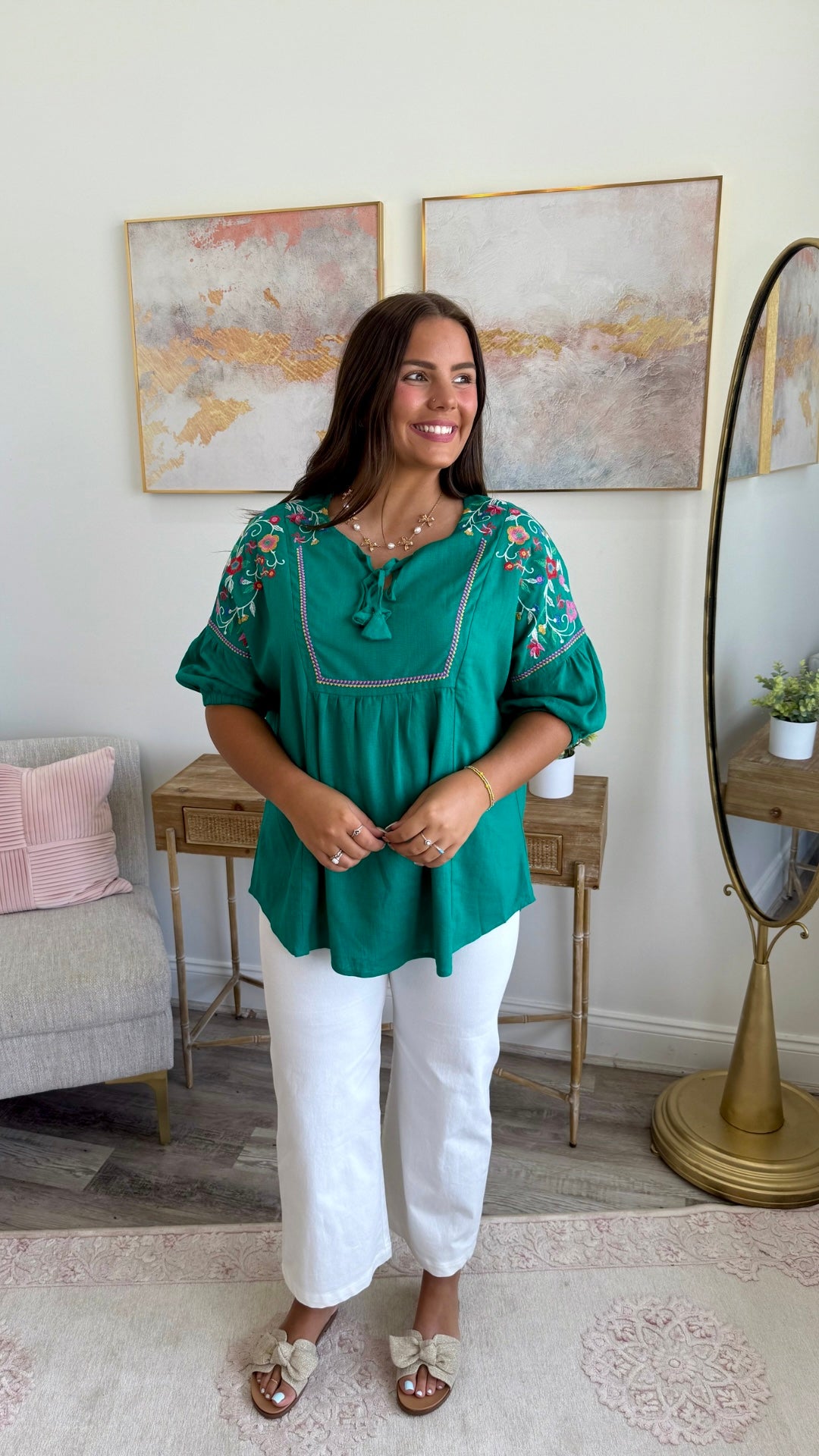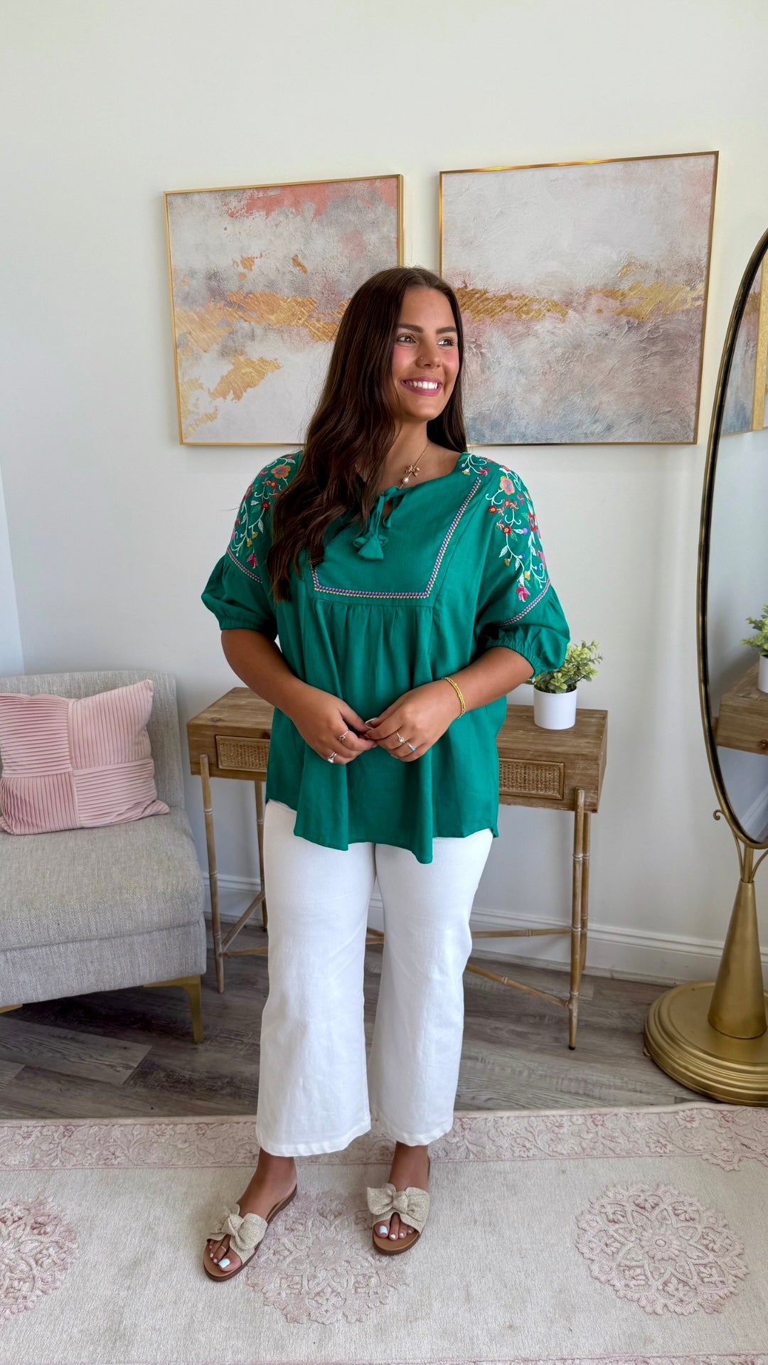 Soft, sweet, and effortlessly pretty — this top features beautifully embroidered floral sleeves that bring a fresh touch to any outfit. Nicole has on a size small, fit runs true to size.