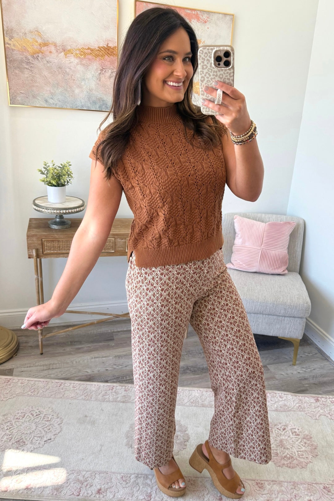 A warm rust-toned knit top with a delicate open-weave pattern and ribbed trim. The cap sleeves and mock neck add a chic touch, making it perfect for pairing with high-waisted pants or skirts for a polished yet cozy look.