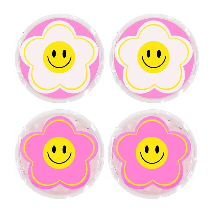 Hot & Cold Flower Power Eye Pads Set. Features 2 pairs of therapeutic reusable gel eye pads. Reduce puffiness & relieves tension. Diminish the appearance of fine lines and puffiness, while revitalizing skin in the eye area. Ideal for reliving migraines, stress related tensions, sinus pain & heat exhaustion. Microwavable and freezable