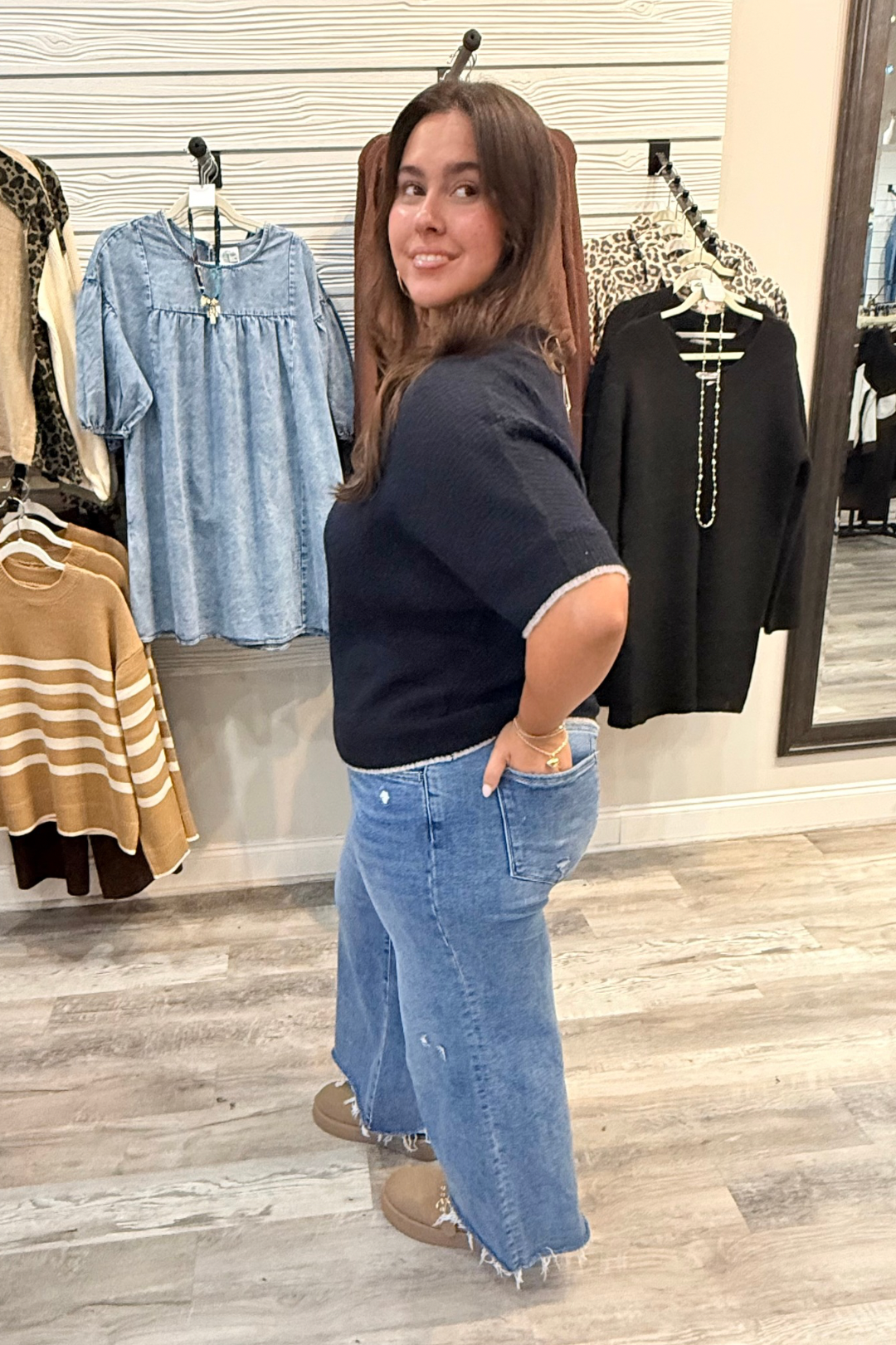 Our Dark Divide Sweater Top is the definition of an everyday basic and closet staple. This super soft short sleeve sweater is perfect for all seasons, and so easy to layer. Fit is true to size.