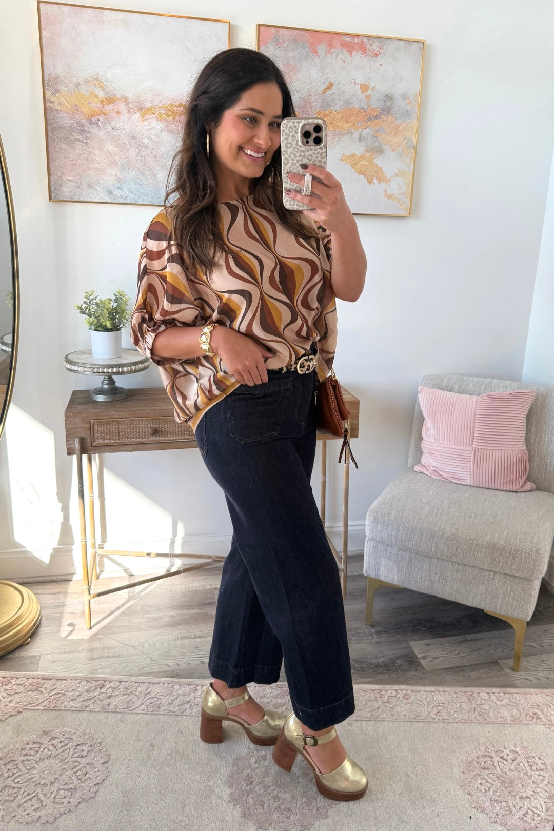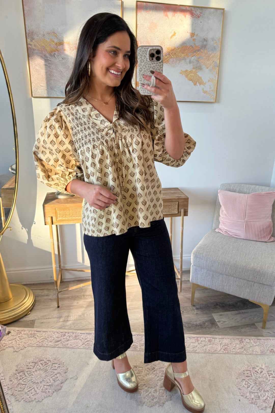 These denim pants are FIRE!!! They are a dark wash wide-leg cropped silhouette. They feature prominent stitching in a contrasting golden color that outlines the seams and pockets. The front rectangular pockets add to the unique flare of these pants. They are high-waisted with a single button and zipper closure.