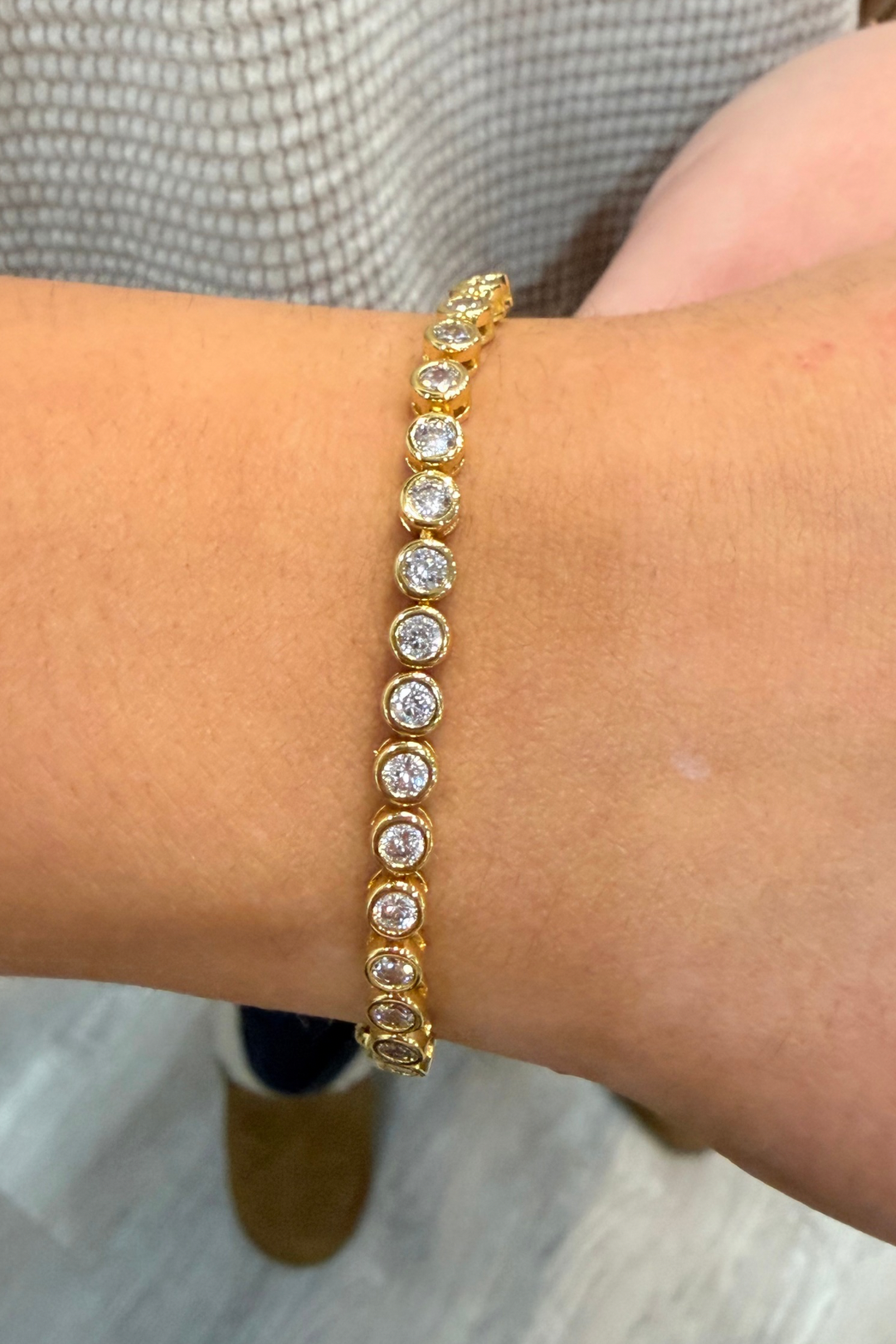 This timeless gold tennis bracelet is the sparkly staple your wrist has been waiting for. It's the perfect everyday luxury that works just as well at brunch as it does at dinner.