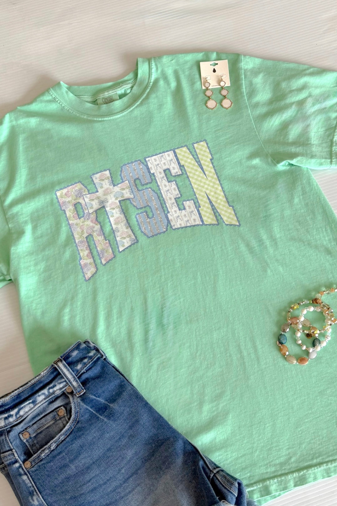 Celebrate faith and fresh spring style with this beautiful Gracefully Risen Tee. Set on a washed green tee, the word “Risen” stands out in a charming mix of floral, stripes, and gingham prints, creating a unique patchwork design that’s both uplifting and stylish.