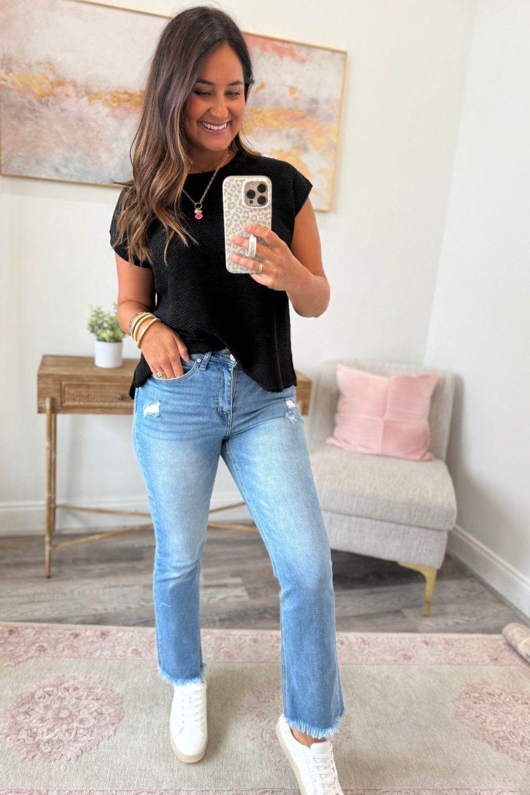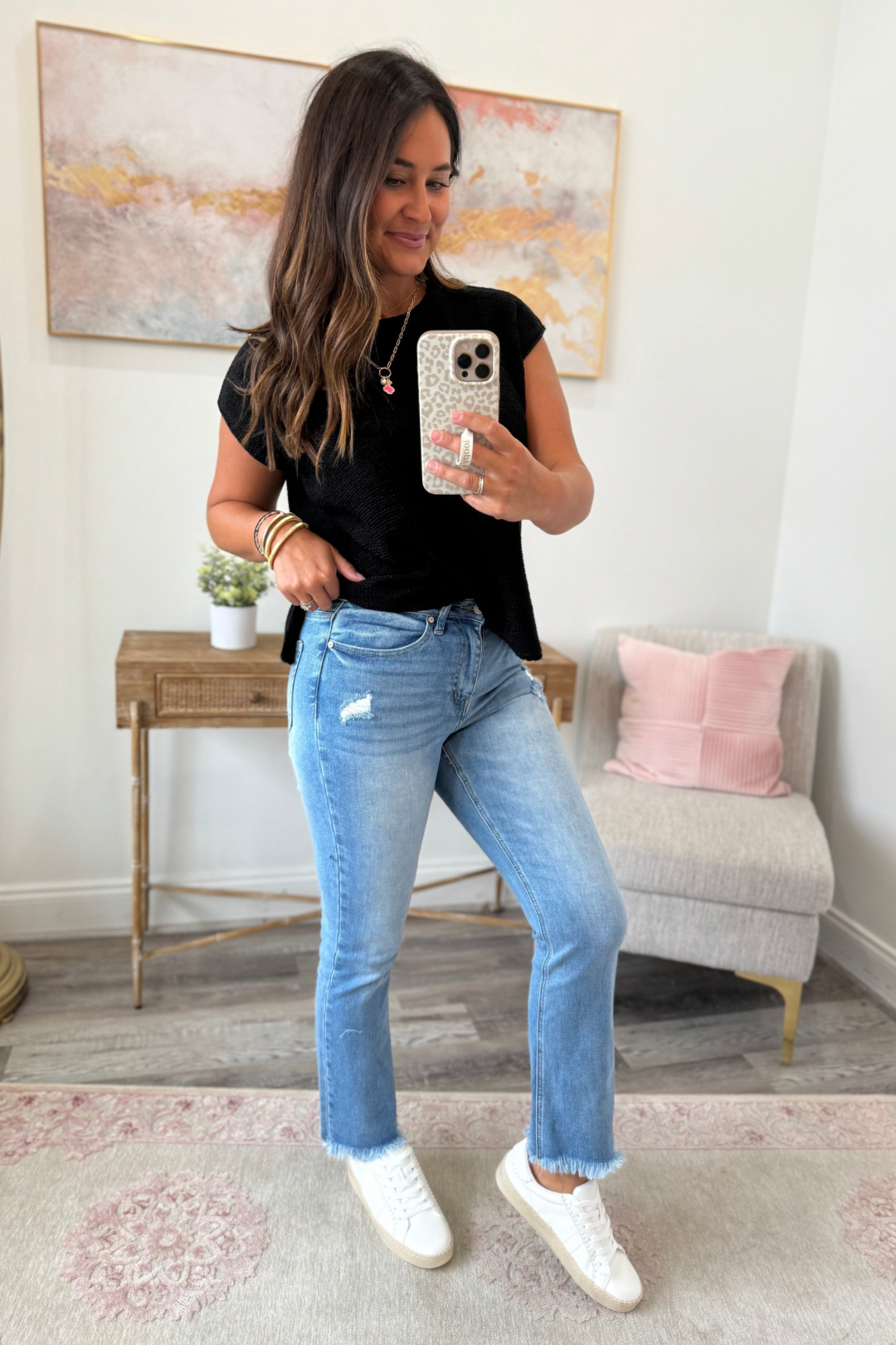 The Jaden Crop Jeans are classic, comfortable and always in style. These have a great fit and really hold everything in. Brittany is wearing a size 26 and it’s typically a size 3/5. These are very true to size. Go with your normal jean size