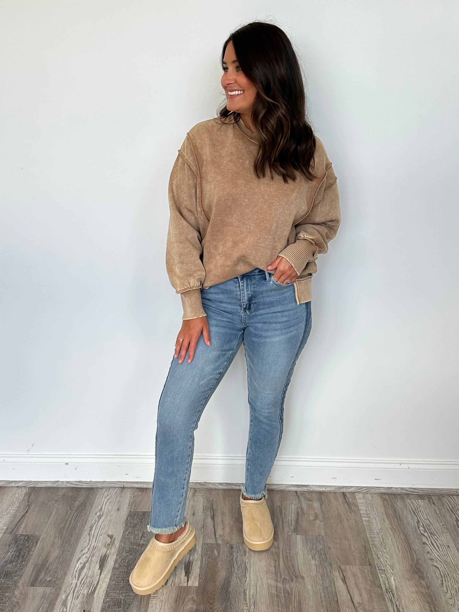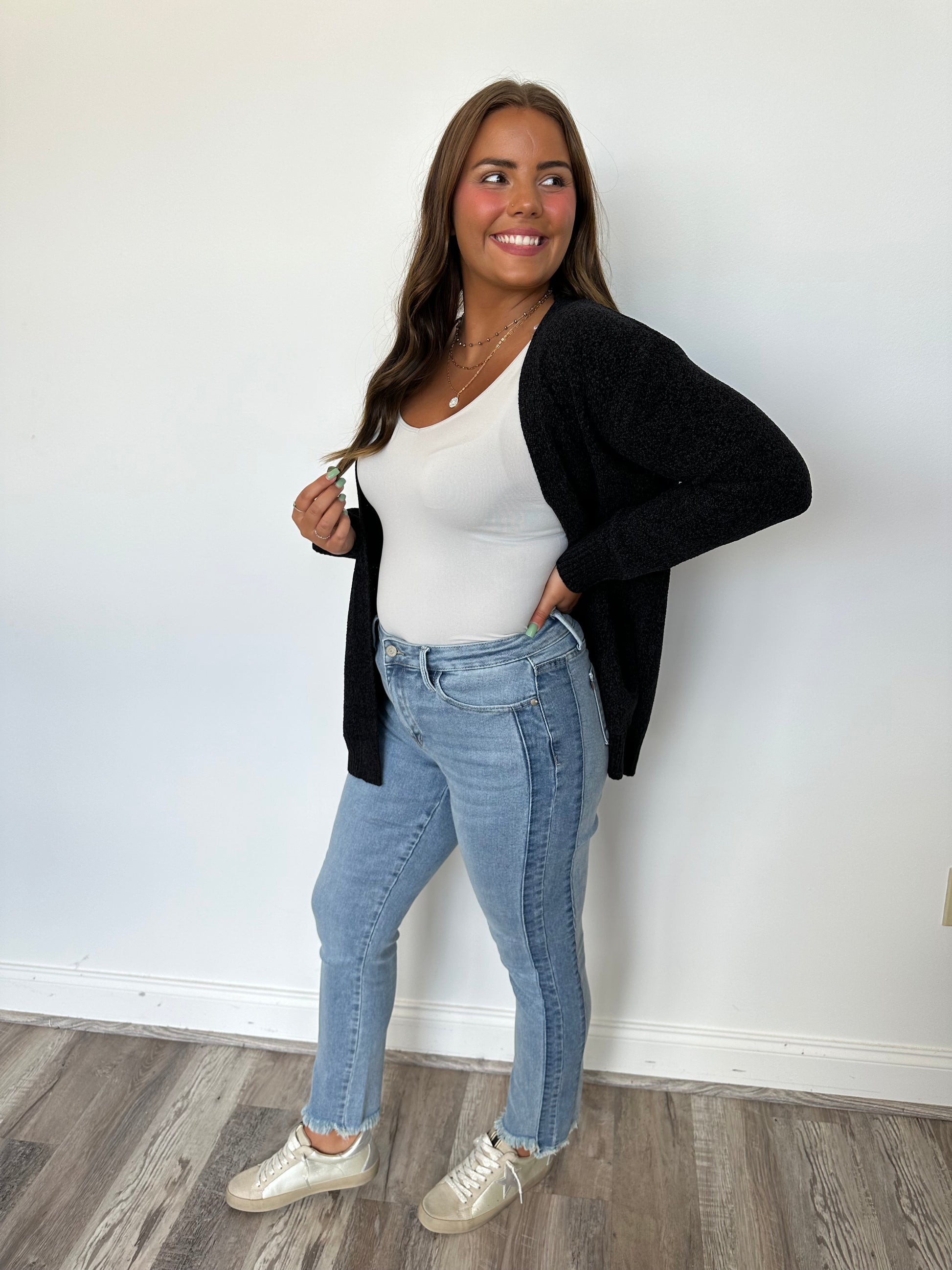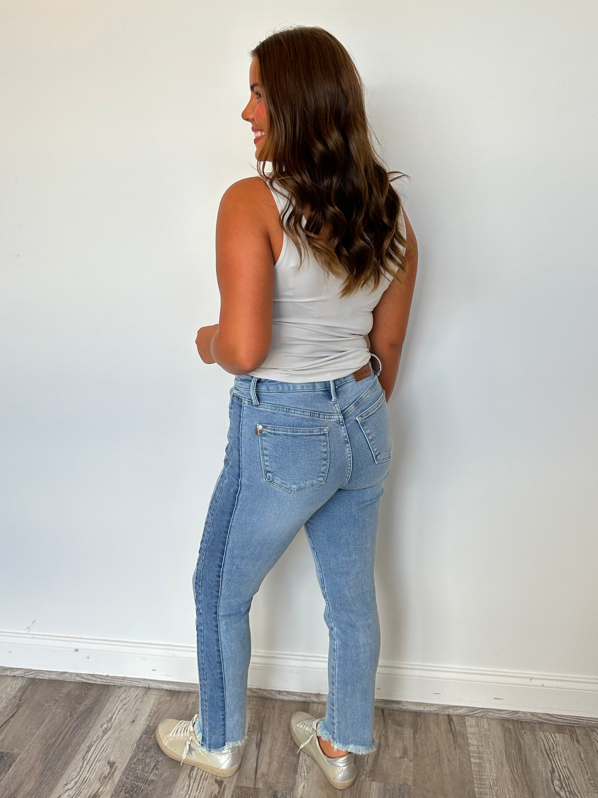 The latest from Judy Blue, these jeans are truly a showstopper! With their unique side detail in a different color and retro vibe, these jeans are a perfect blend of trendy and classic. The frayed hem adds a touch of edginess that will make you stand out from the crowd. Judy Blue is known for their forgiving fit, so you can feel confident and comfortable in these jeans all day long. We recommend sizing down two sizes for the perfect fit.