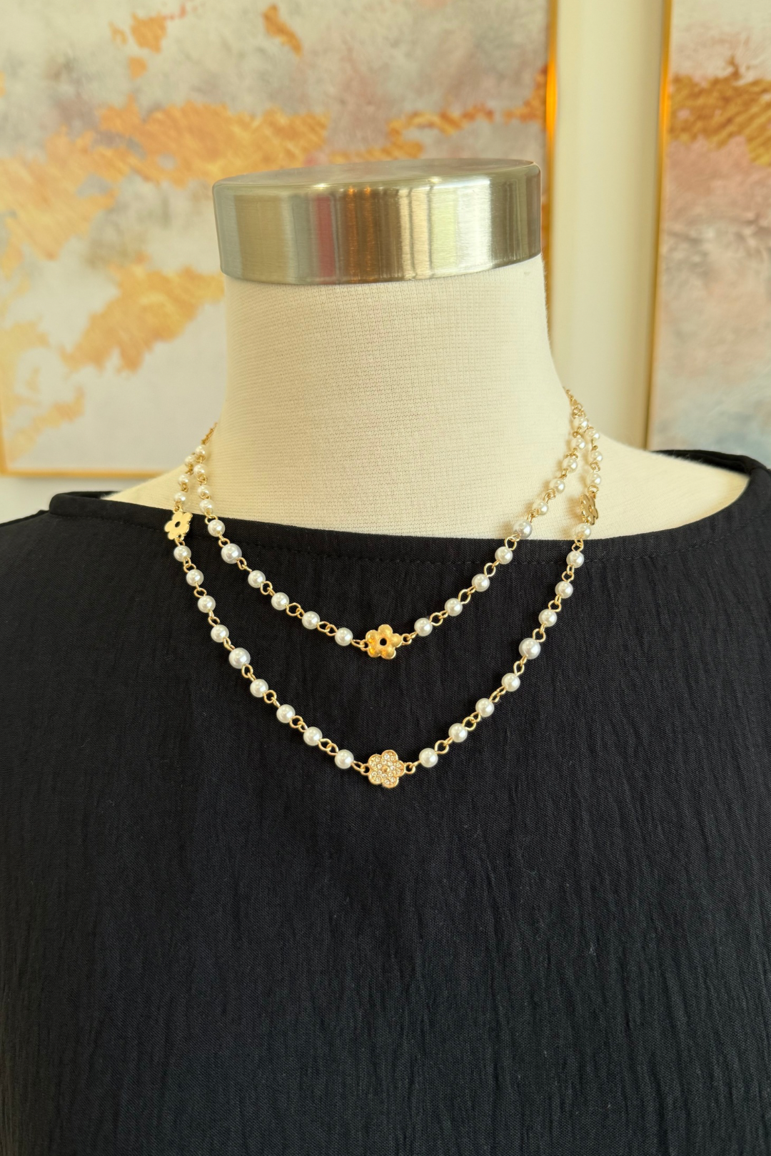 Layered Pearl Beaded Chain Link Necklace Featuring Rhinestone & Metal Tone Flower Stations