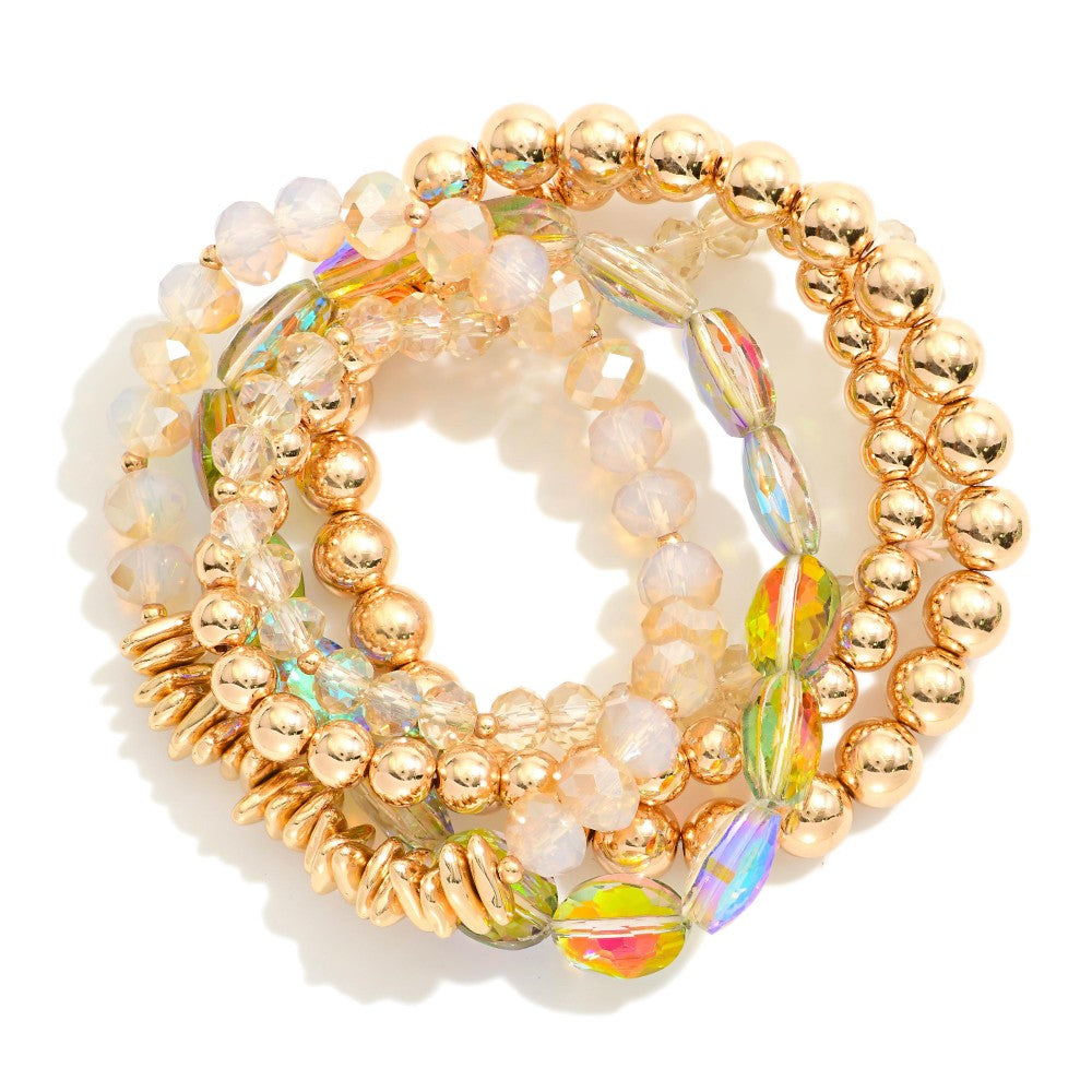 Set Of Five Beaded Stretch Bracelets Featuring Metal Tones, Faceted Beads, & Glass Crystal