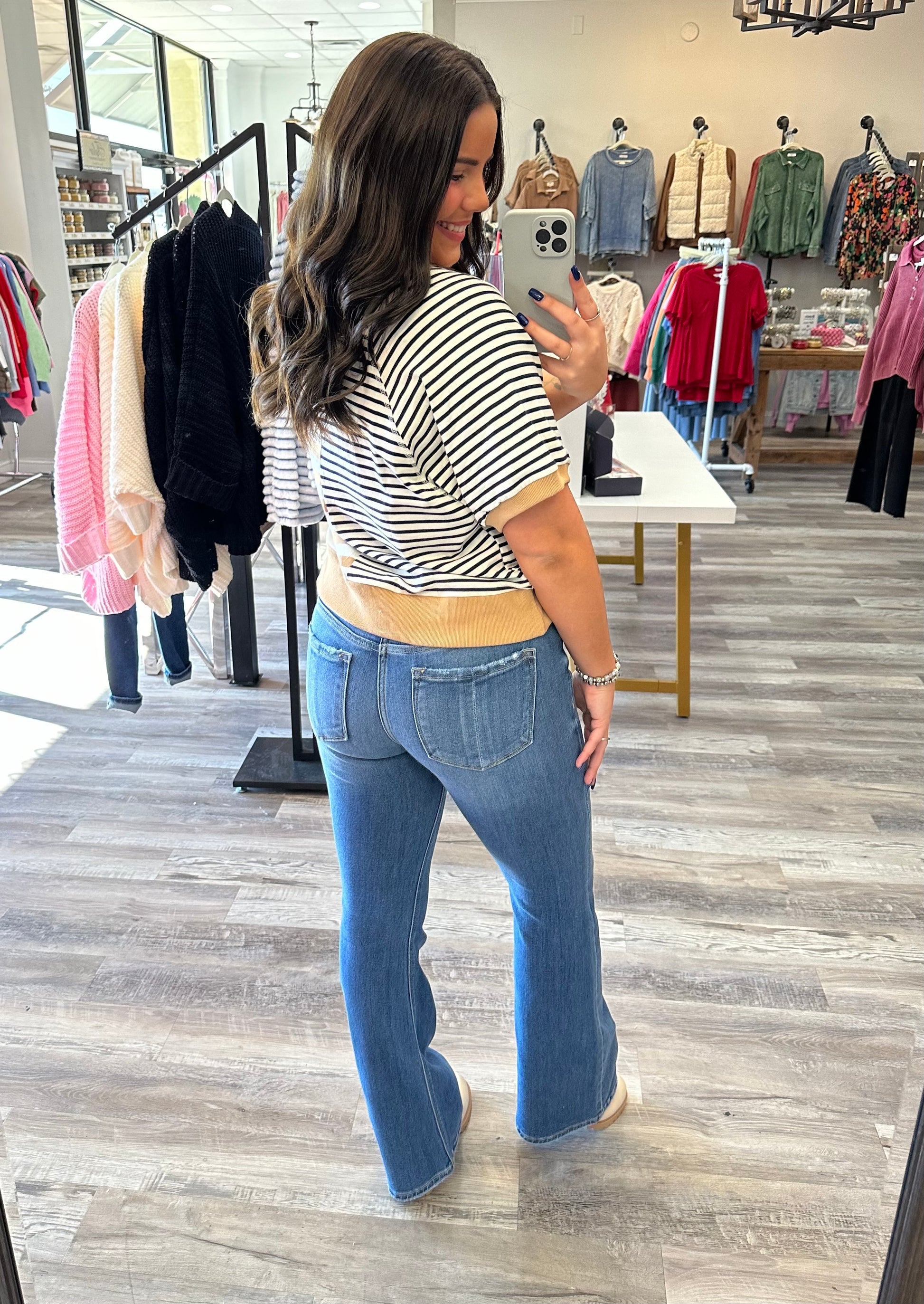 Introducing our Madeliine Tummy Control Basic Flare! These fabulous jeans are designed to flatter with a super stretchy fit and made from high-quality material. They offer the perfect blend of comfort and style. Nicole is wearing a size 5, and they are from the trusted brand Risen.