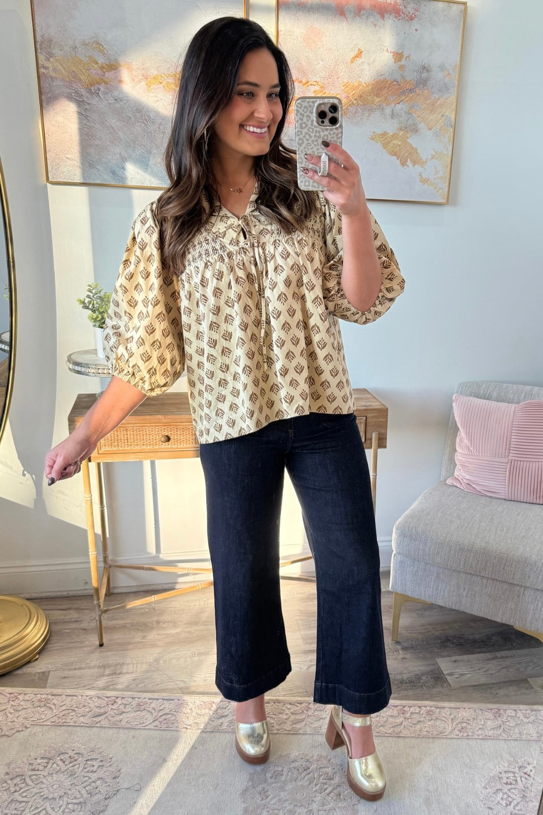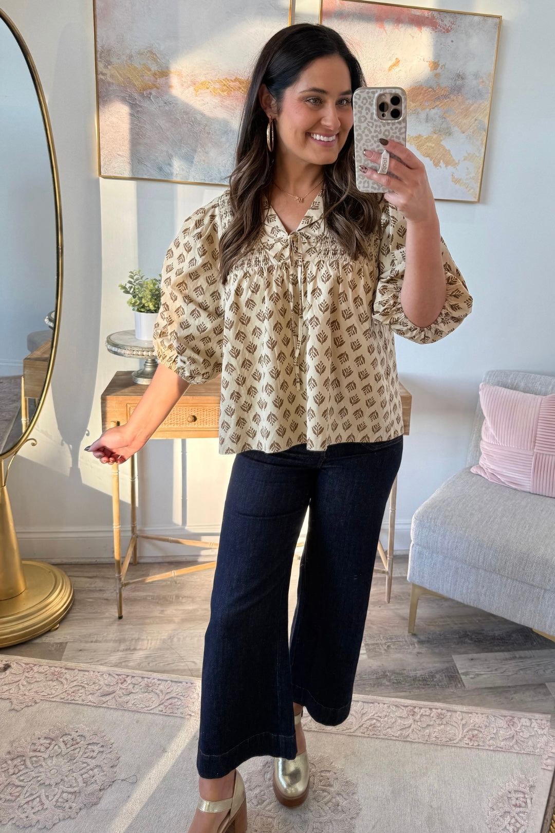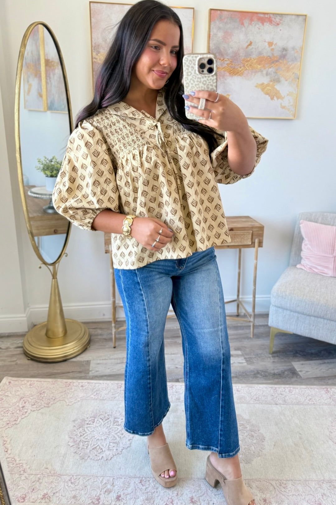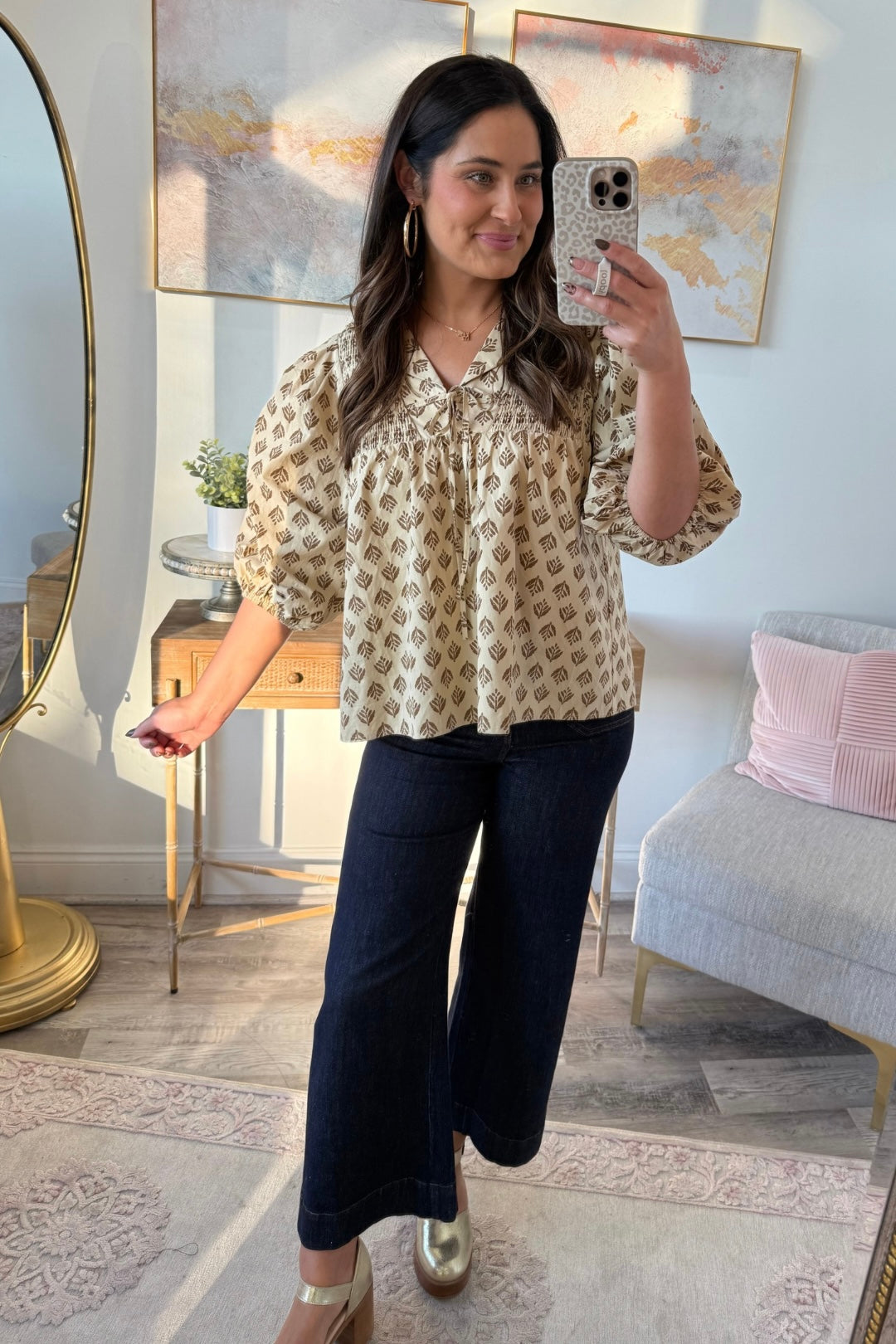 This blouse brings effortless charm to your wardrobe. It features a tie front neckline, and voluminous puff sleeves. It strikes the perfect balance of boho and trendy. The lightweight fabric and subtle floral inspired print make it such a good everyday top.