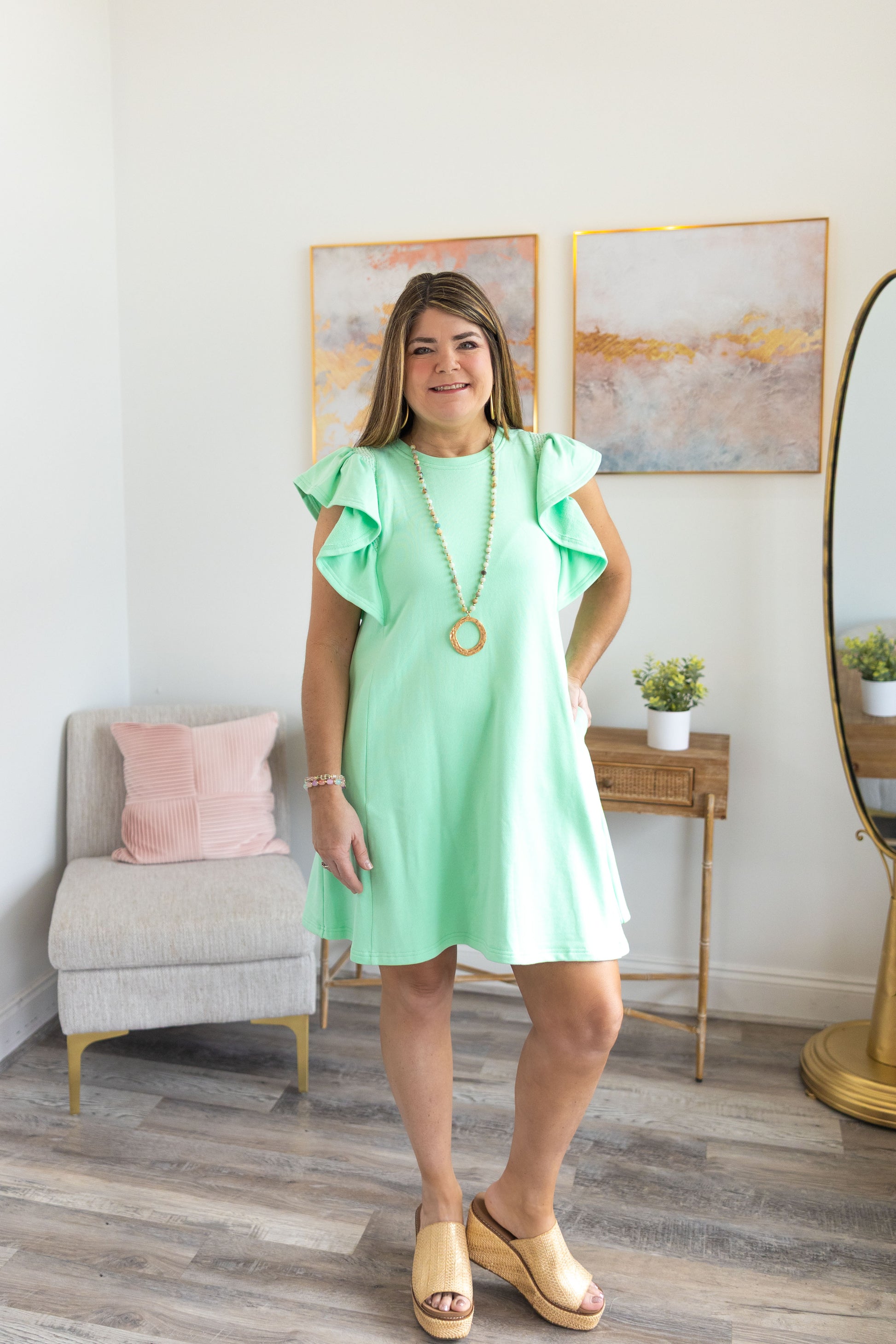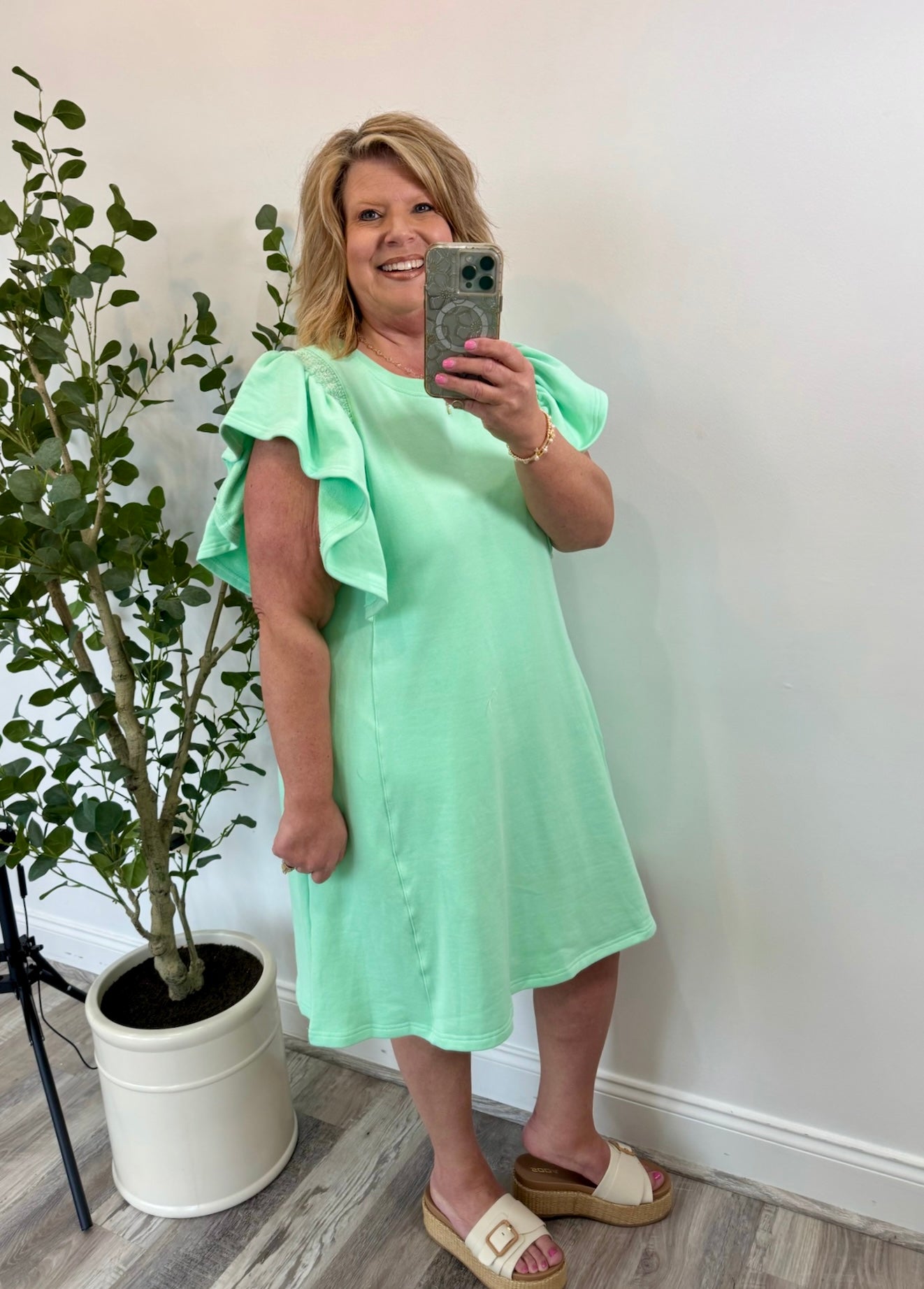 Introducing our Mint Fresh Terry Ruffle Dress—truly “mint” to be your go-to piece for effortless style and comfort! This delightful dress combines a playful aesthetic with the cozy feel of terry fabric, making it perfect for casual outings or relaxing at home.The charming ruffle sleeve detail adds a touch of whimsy and femininity, elevating the overall look while keeping it fun and flirty. To top it off, the dress has pockets! Fits is roomy. Nicole and Kim have on the small. Karen is wearing the  XL.