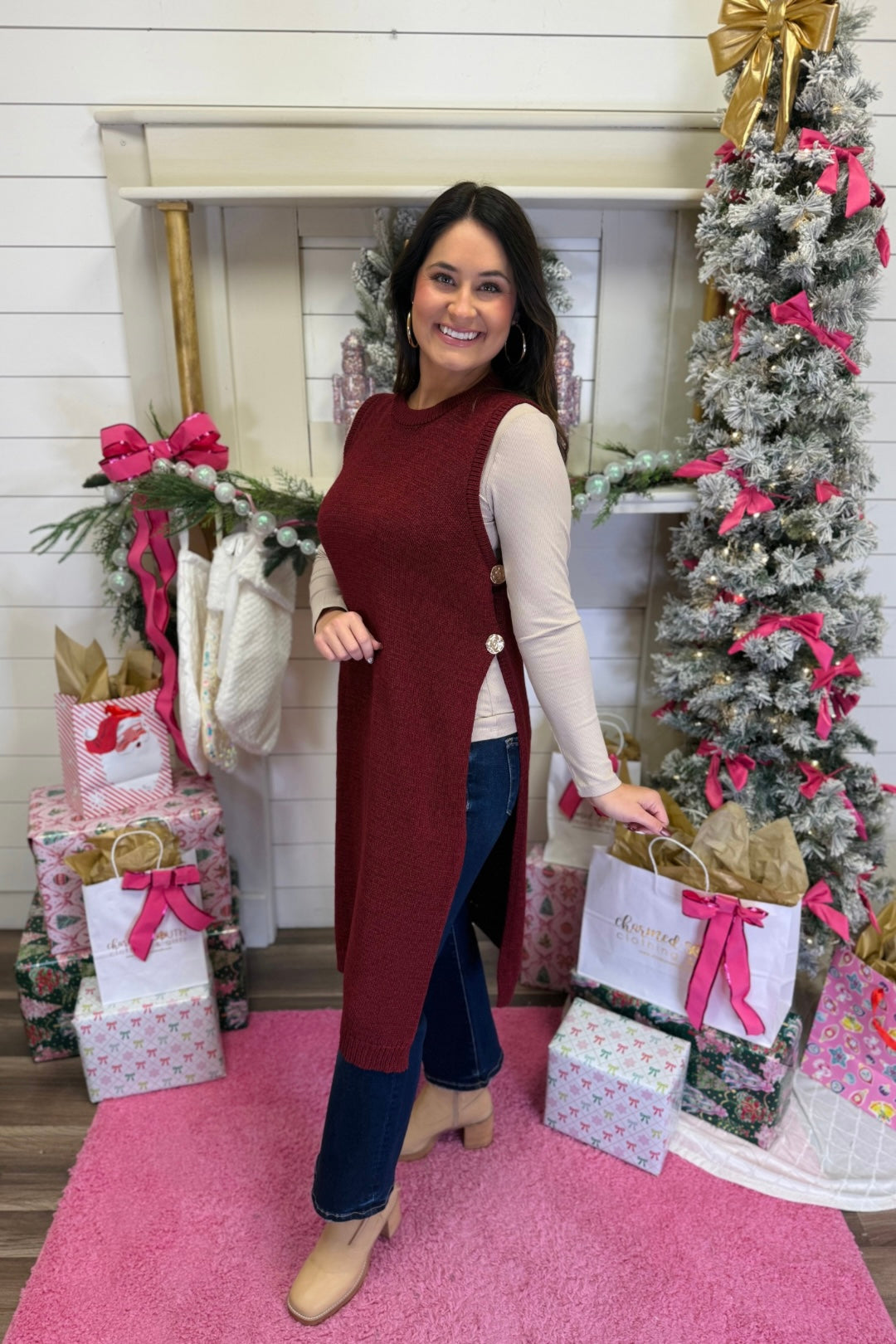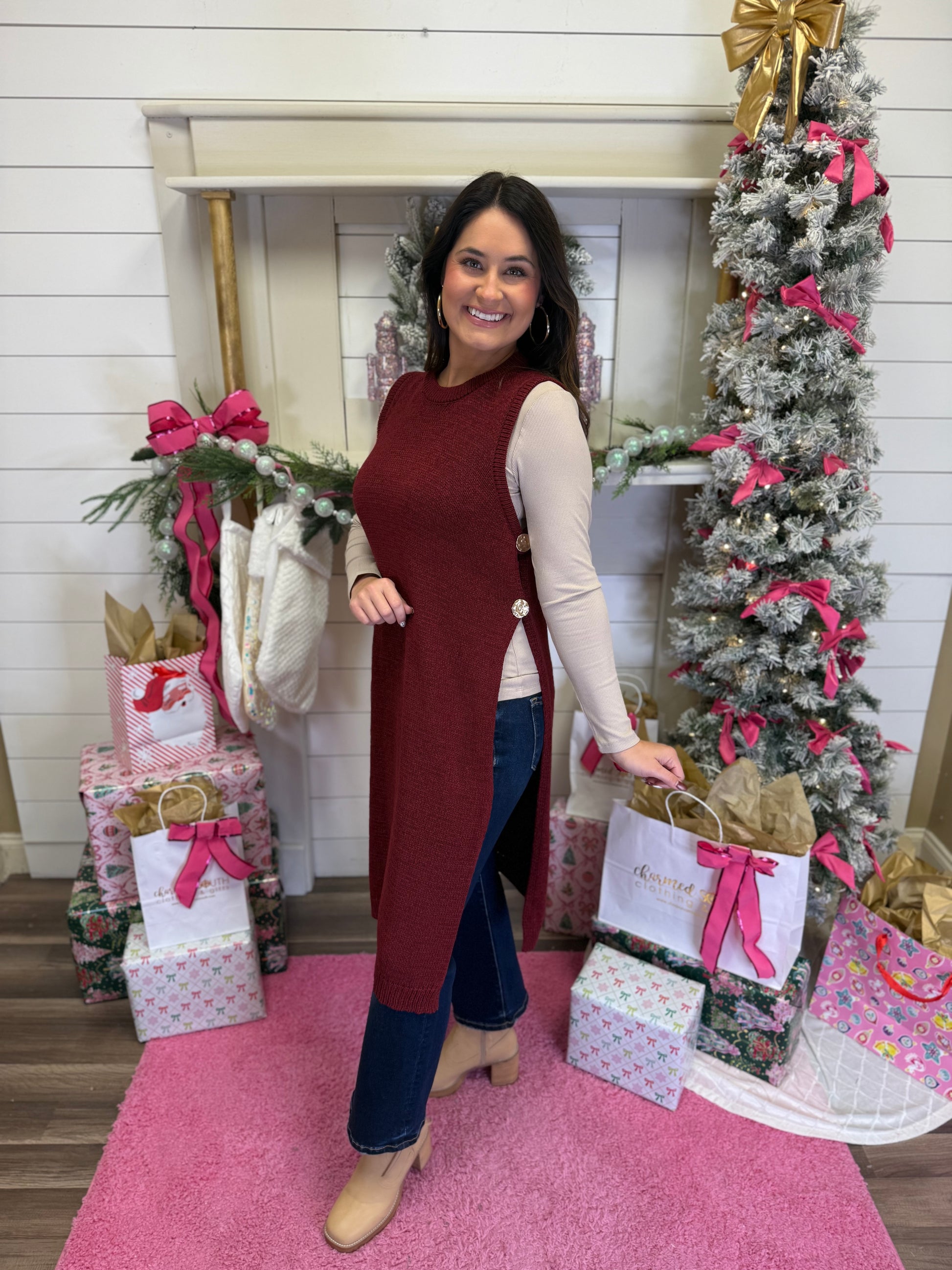 – Effortlessly chic, this neutral knit tunic sweater features a sleeveless cut, side button accents, and dramatic side slits for easy layering. Perfect for pairing with denim or leather leggings for a modern look.