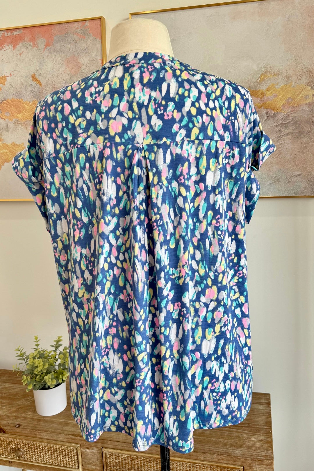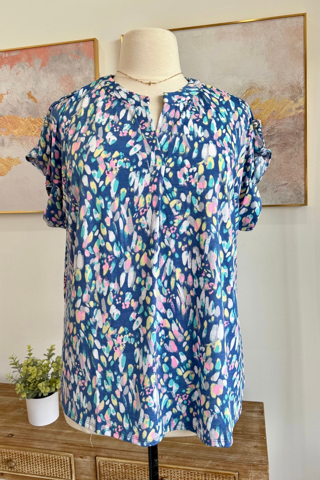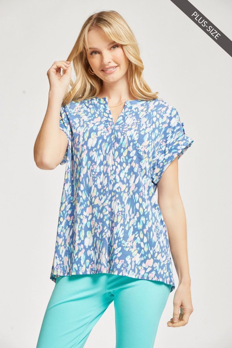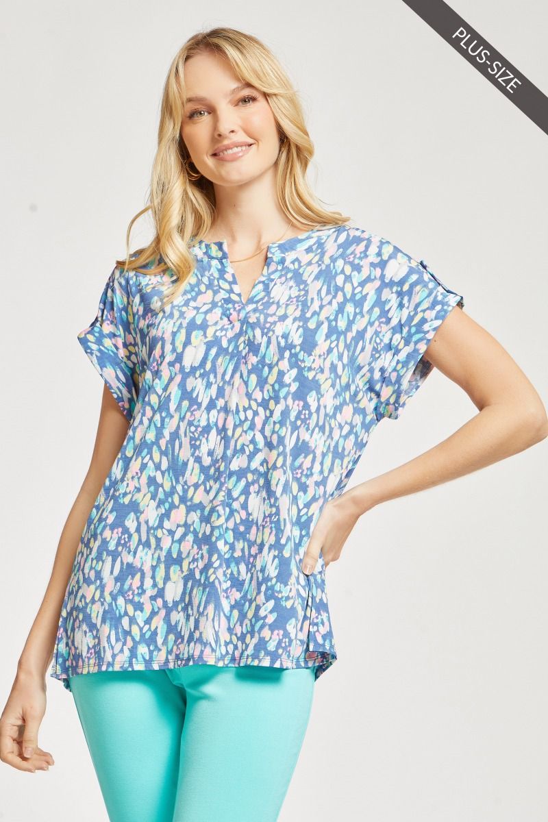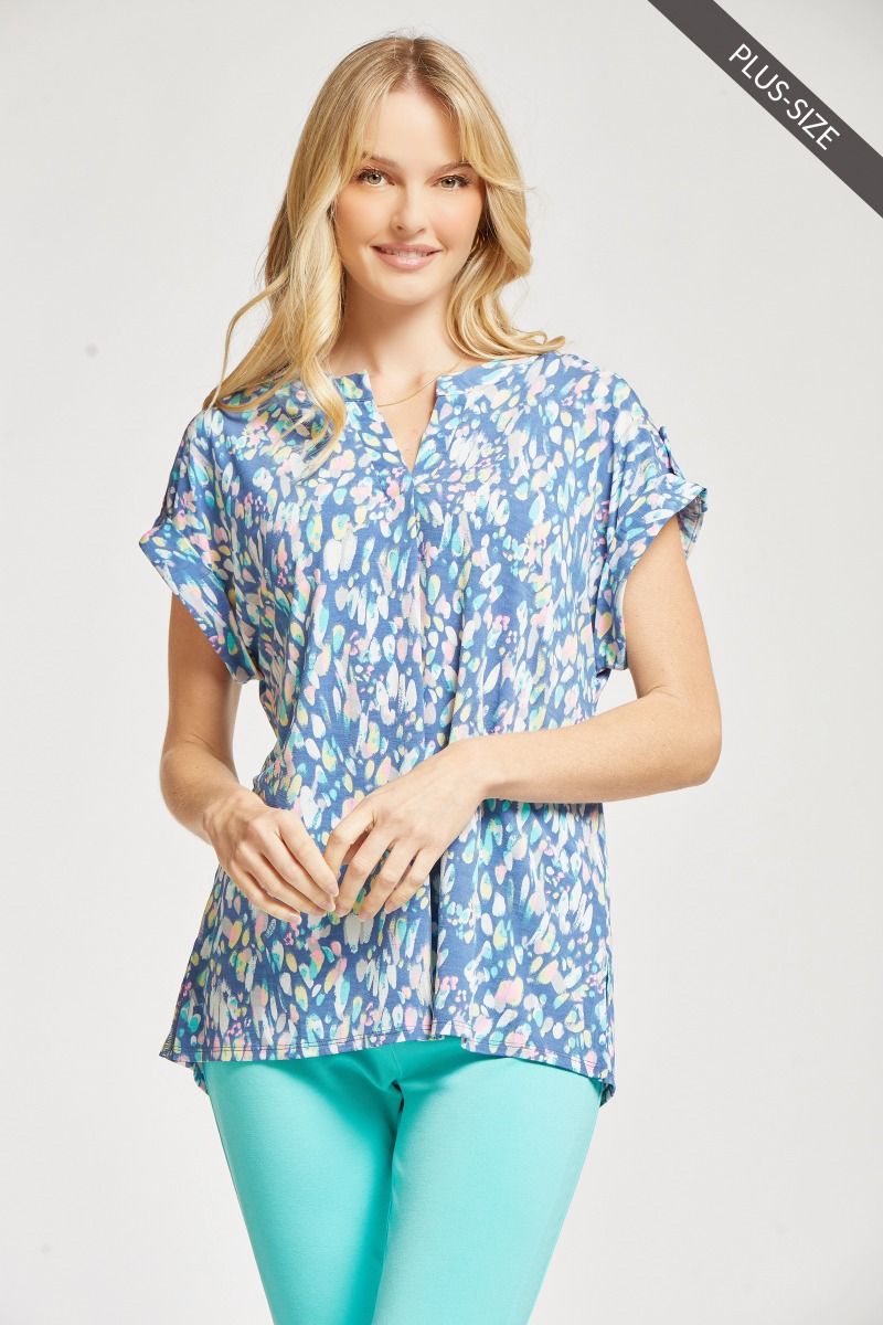 Fun printed dolman sleeve top featuring split neckline with relaxed bodice and fit. Fit runs true to size, size up for roomier fit.