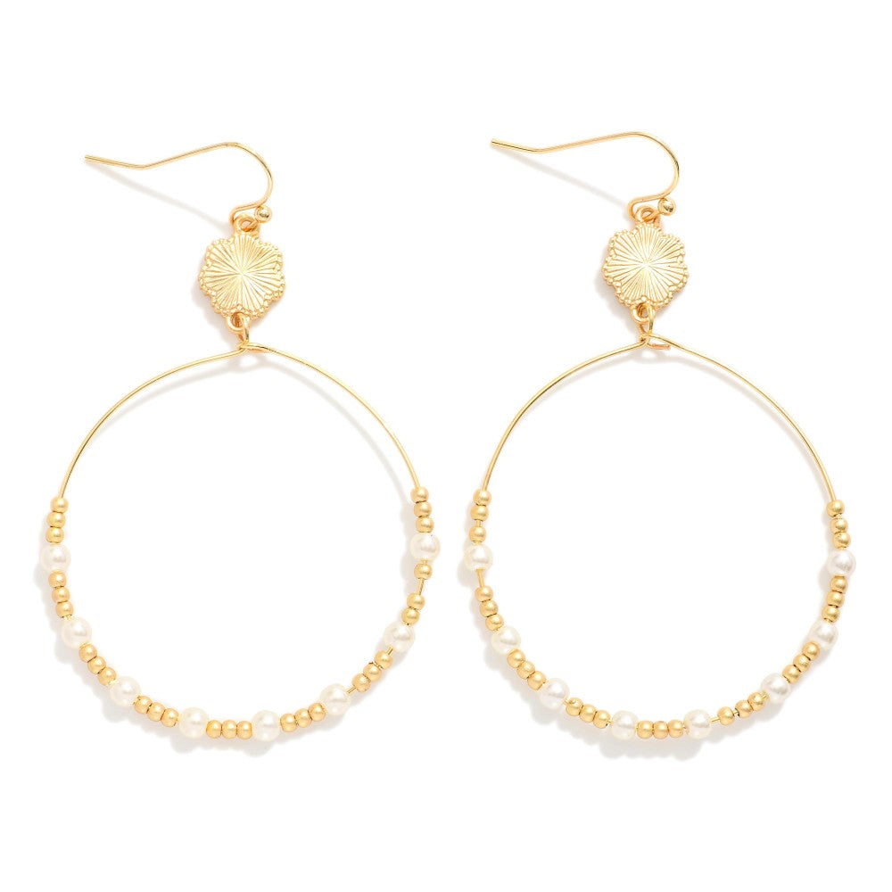 Metal Tone & Pearl Beaded Wire Hoop Drop Earrings Featuring Linked Textured Flower Detail