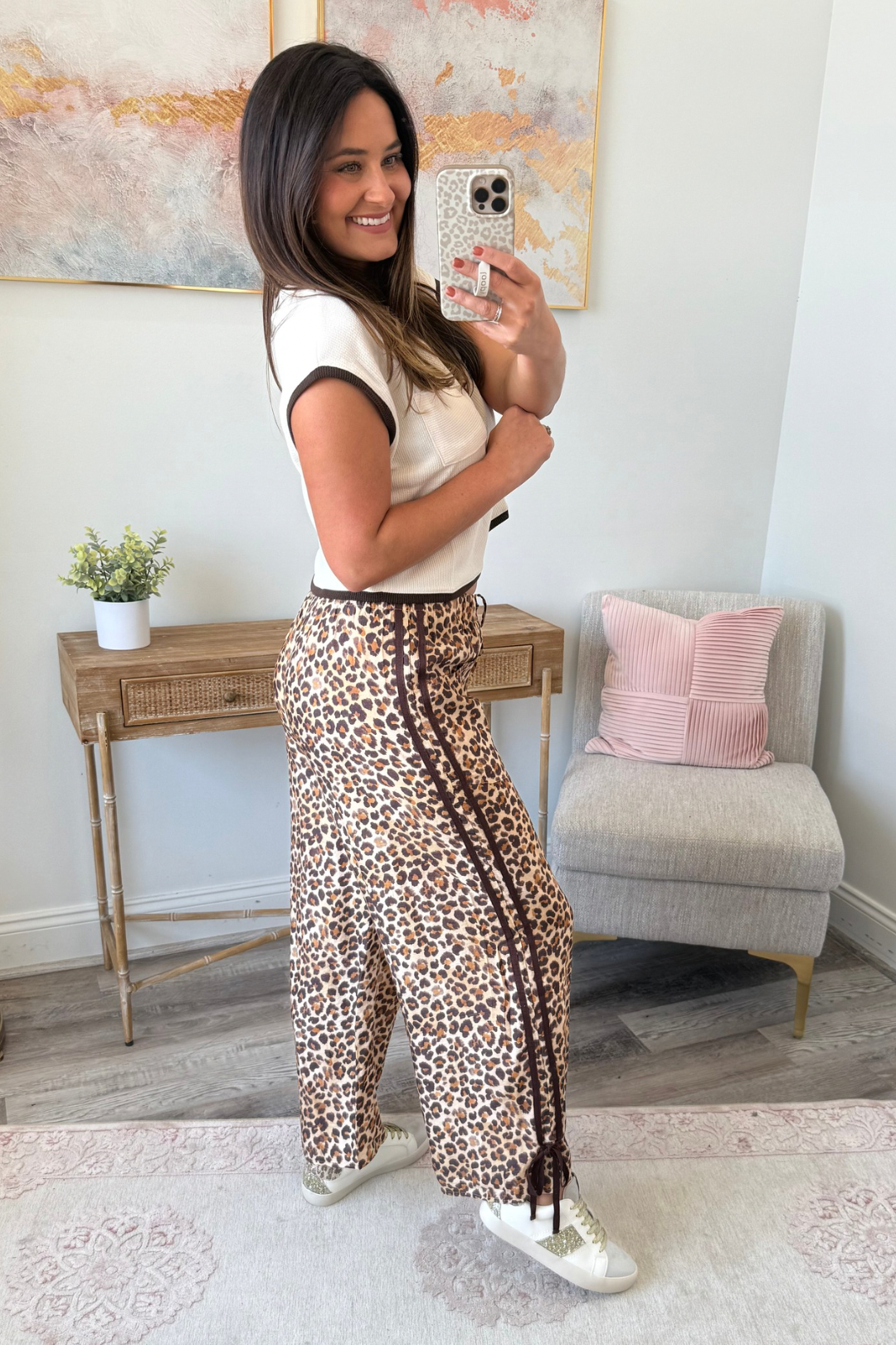 Leopard Print relaxed fit pant with contrasting stripes down the side that tie at the hem. Features an elastic waistband, drawstring and pockets.