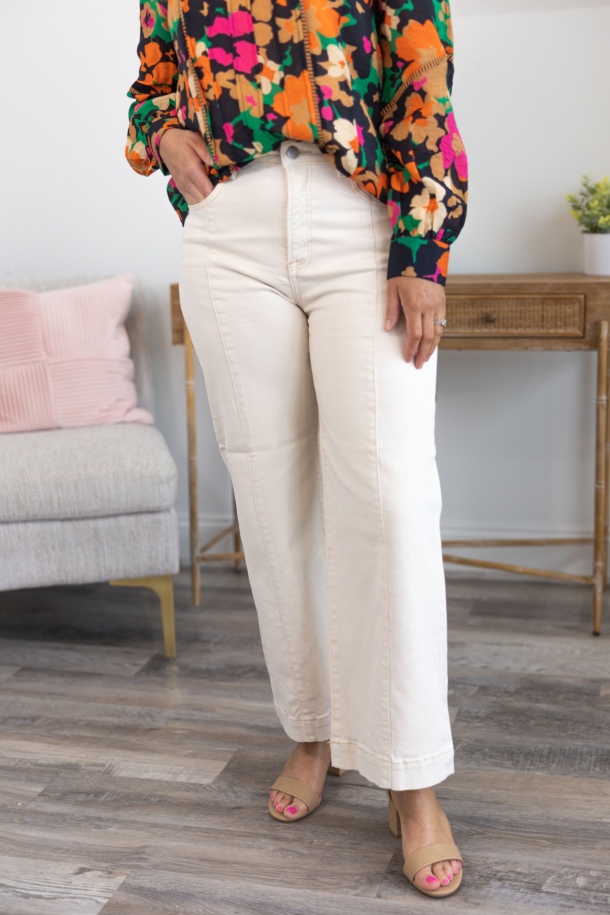 Introducing our Runway Rave Jeans! These jeans are a the perfect cream color to go with all the fun tops! We recommend sizing up twice from your normal size, these jeans run small! Brittany has on a size 7 and is usually a 3.
