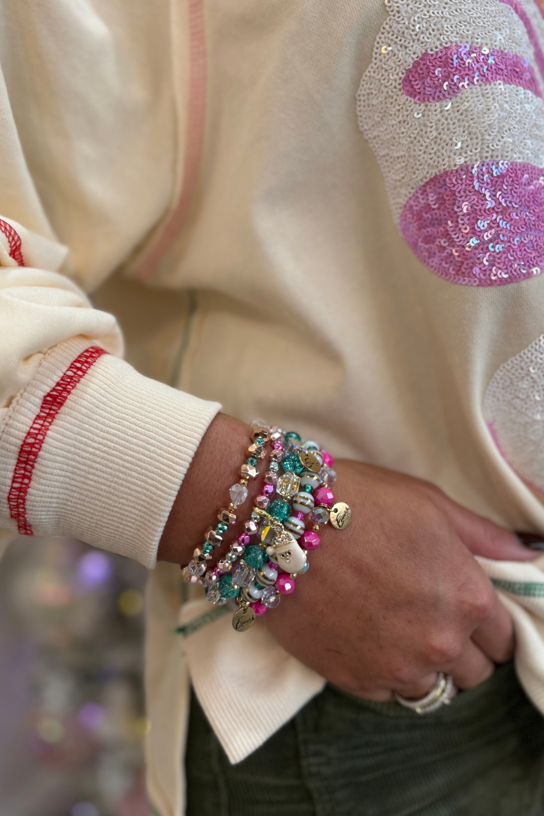 Wrap yourself in holiday sparkle with the Sequin Claus Kiss Pullover! This sweet cream pullover features a playful Santa face crafted from shimmering sequins, complete with a festive bow for his signature smile. Whether you’re sipping cocoa by the fire or attending a holiday party, this pullover adds a touch of sparkle and whimsy to your seasonal wardrobe.