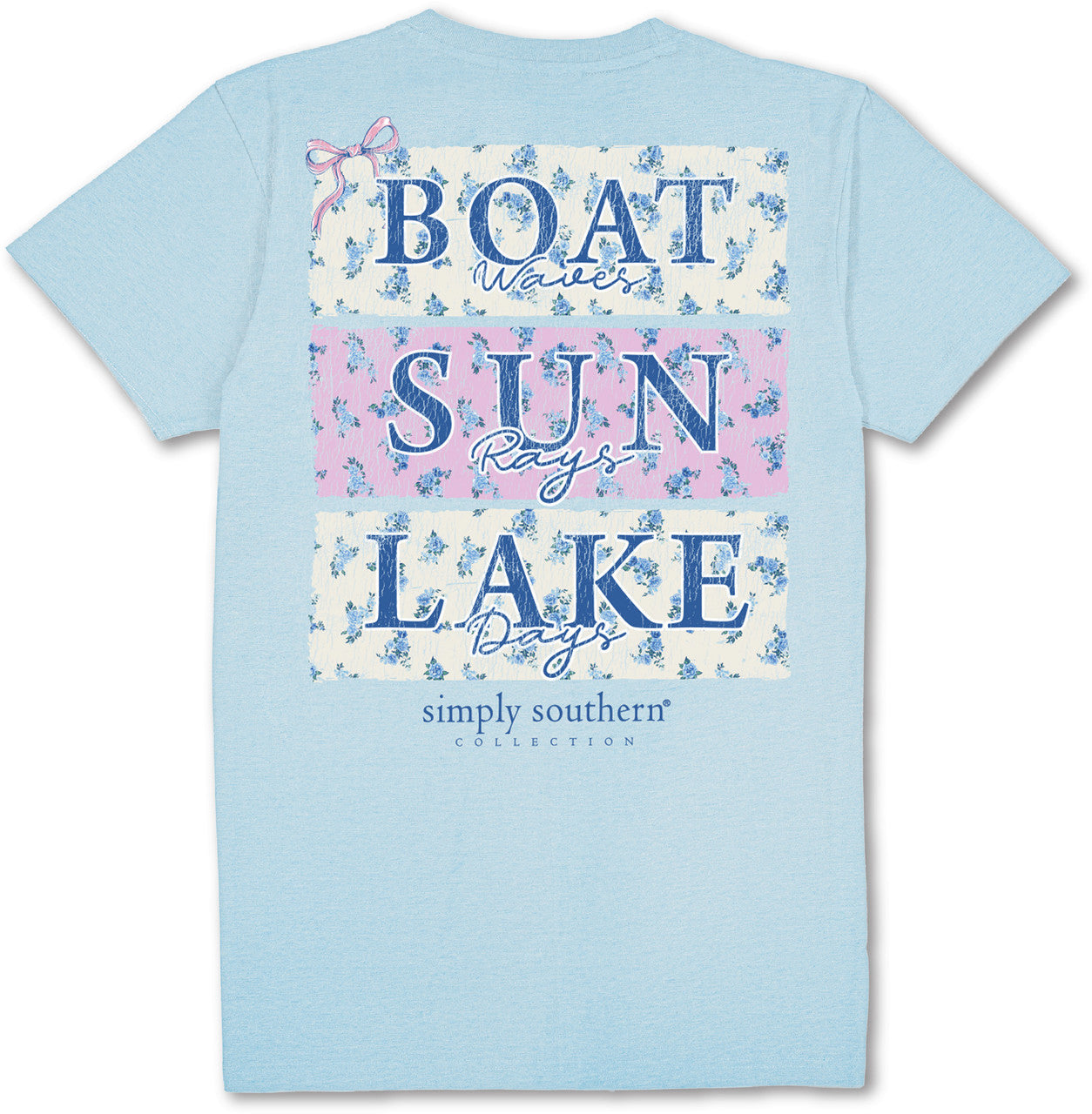 Light pink short sleeve shirt with the phrase 'Boat Waves, Sun Rays, Beach Days' on a floral background. Simply Southern logo below. Similar design on left chest. 100% cotton.