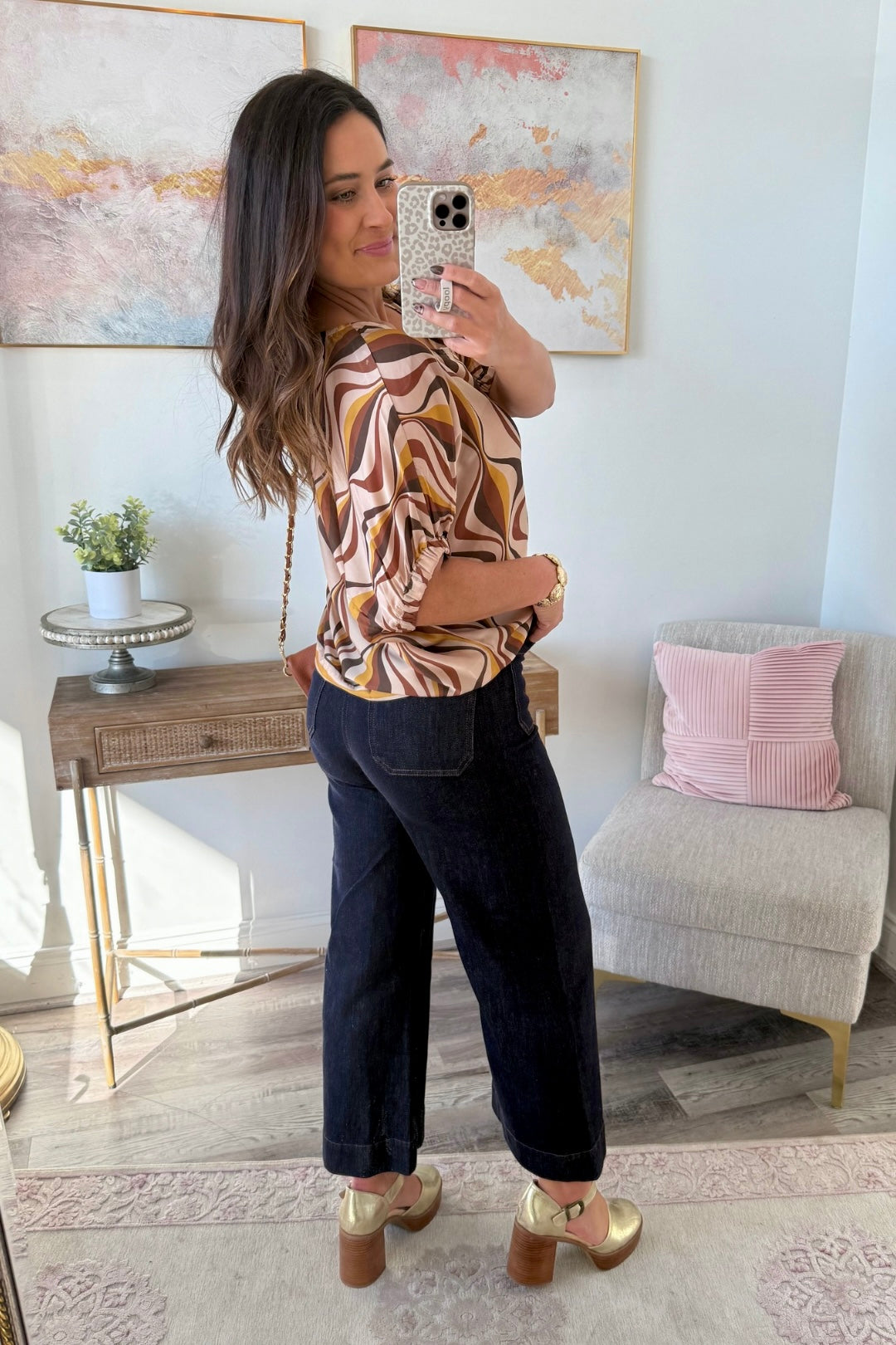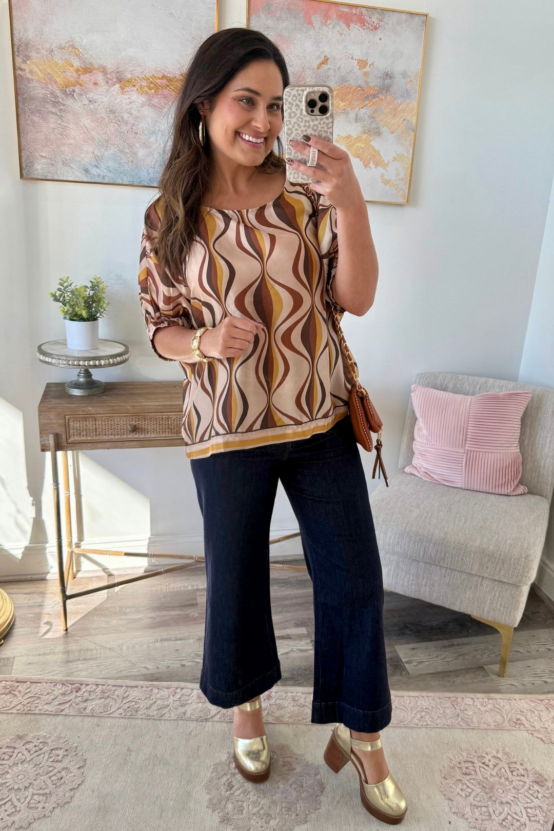 This Sunset Groove top is all about a retro flair with a modern twist. This top is a silky lightweight fabric with a bold wavy geometric print in earthy, sunset inspired tones. It has a groovy vibe that is both playful and eyecatching.