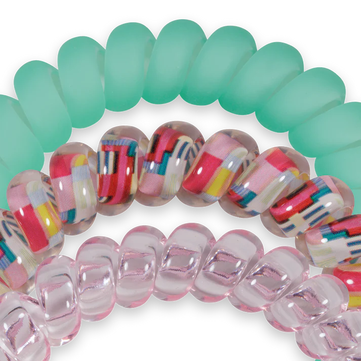 Spring Splash Hair Ties in Green and Pink offer a strong grip without damage, doubling as a chic wrist accessory when not in use. Your new favorite hair essentials all year round.