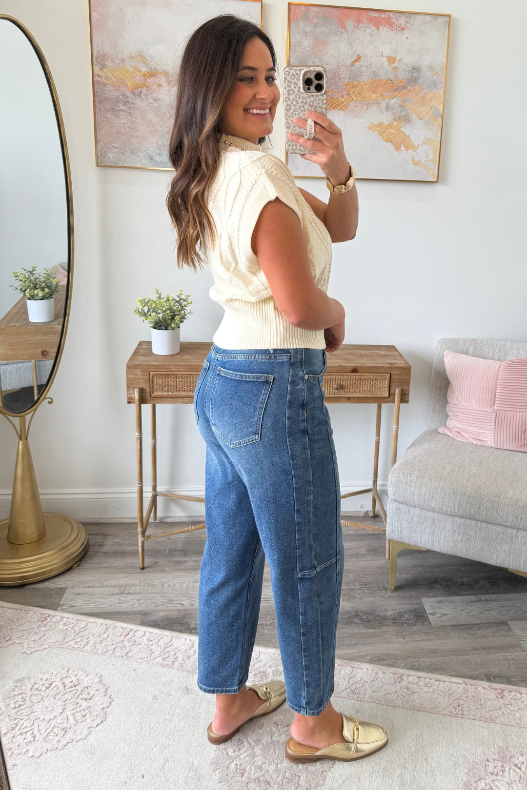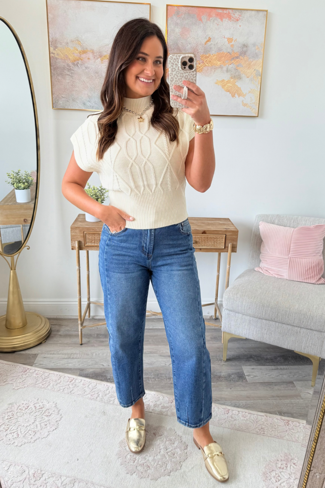 Talk about a staple piece, our Vanilla Stitch Sweater Top is a must have for your wardrobe. This top is so versatile and a fun fashion basic. Features a mock neck and an elastic band at the bottom.