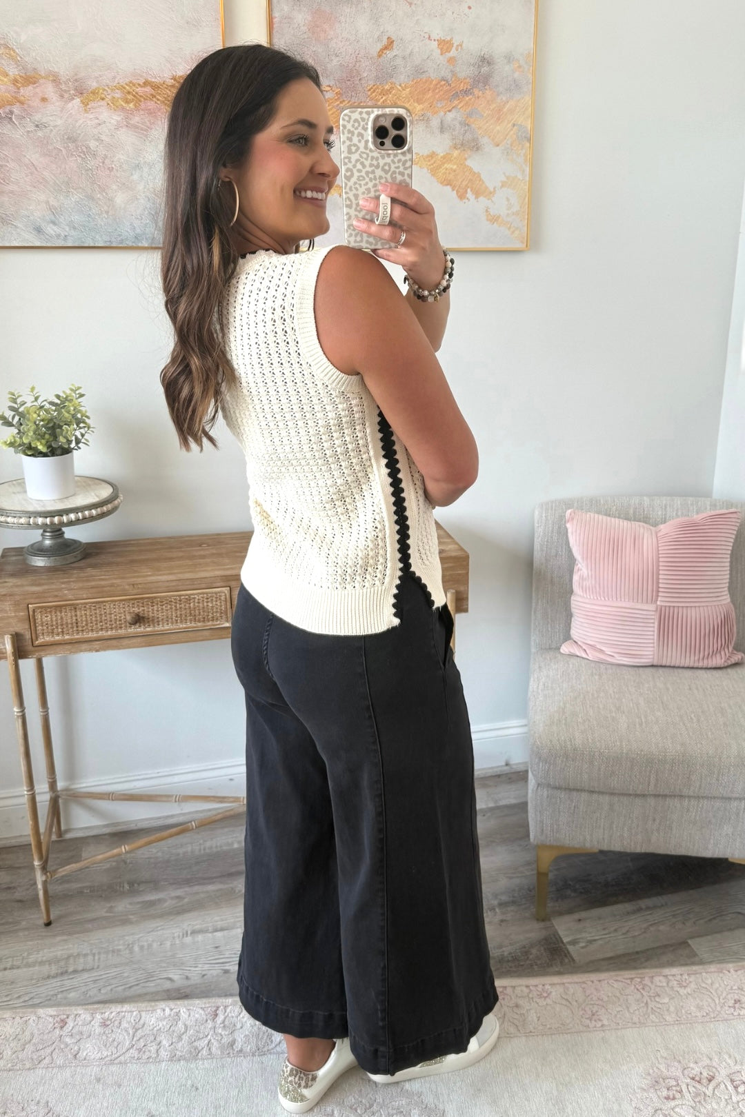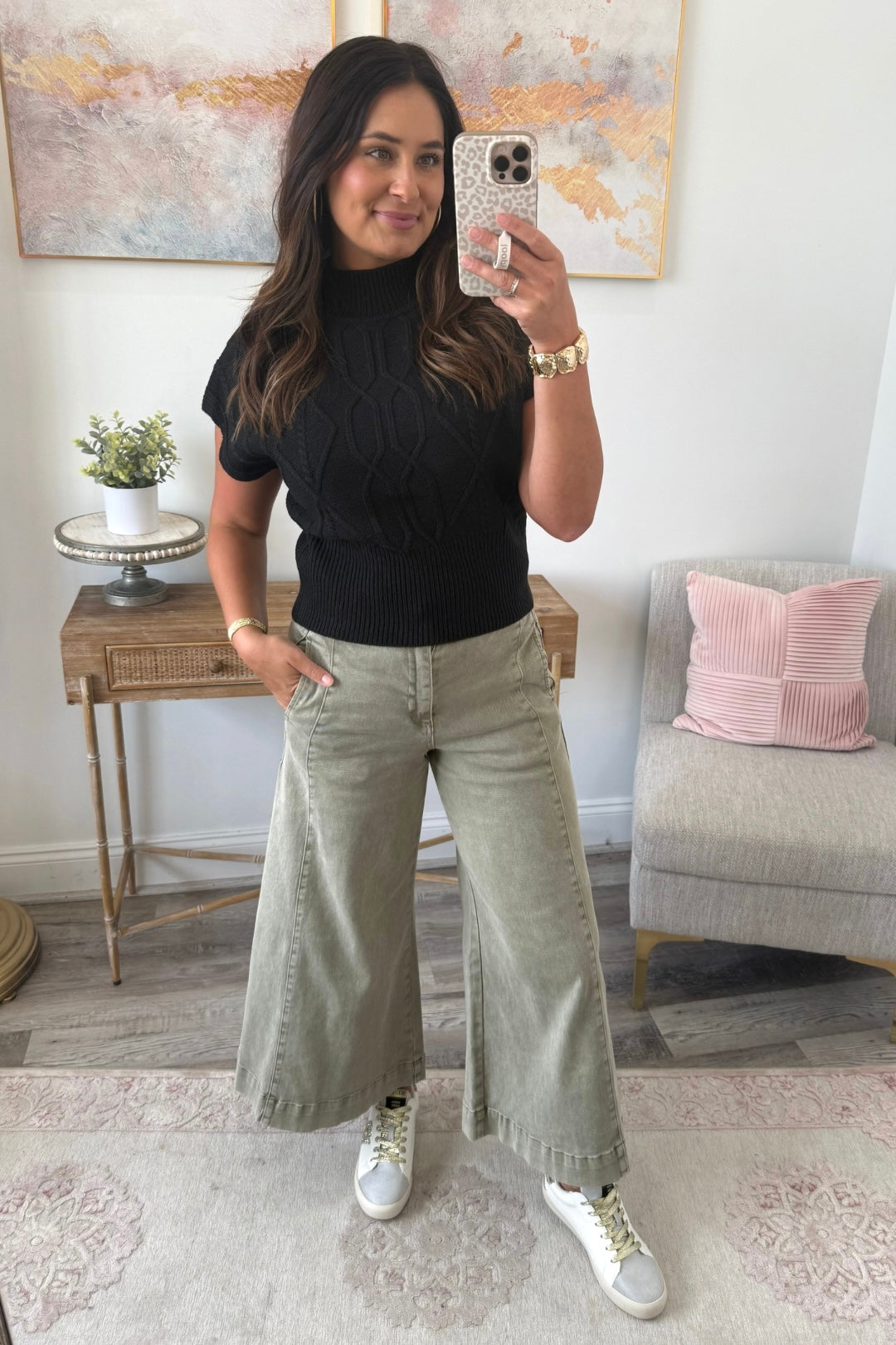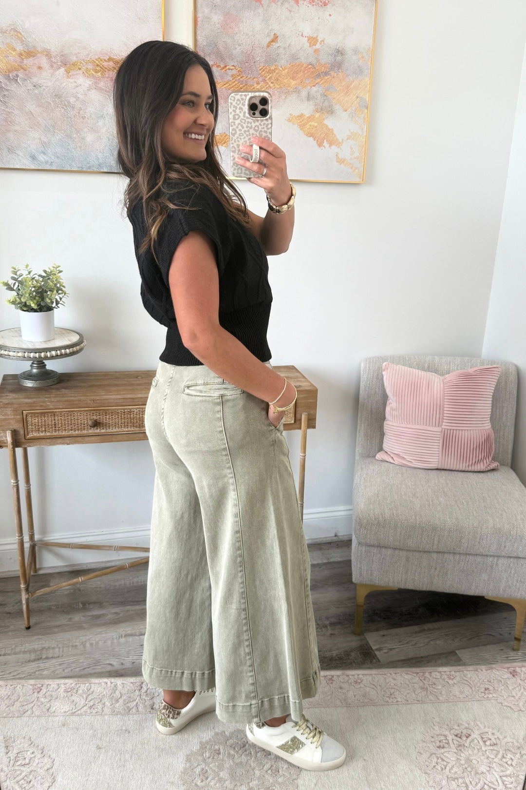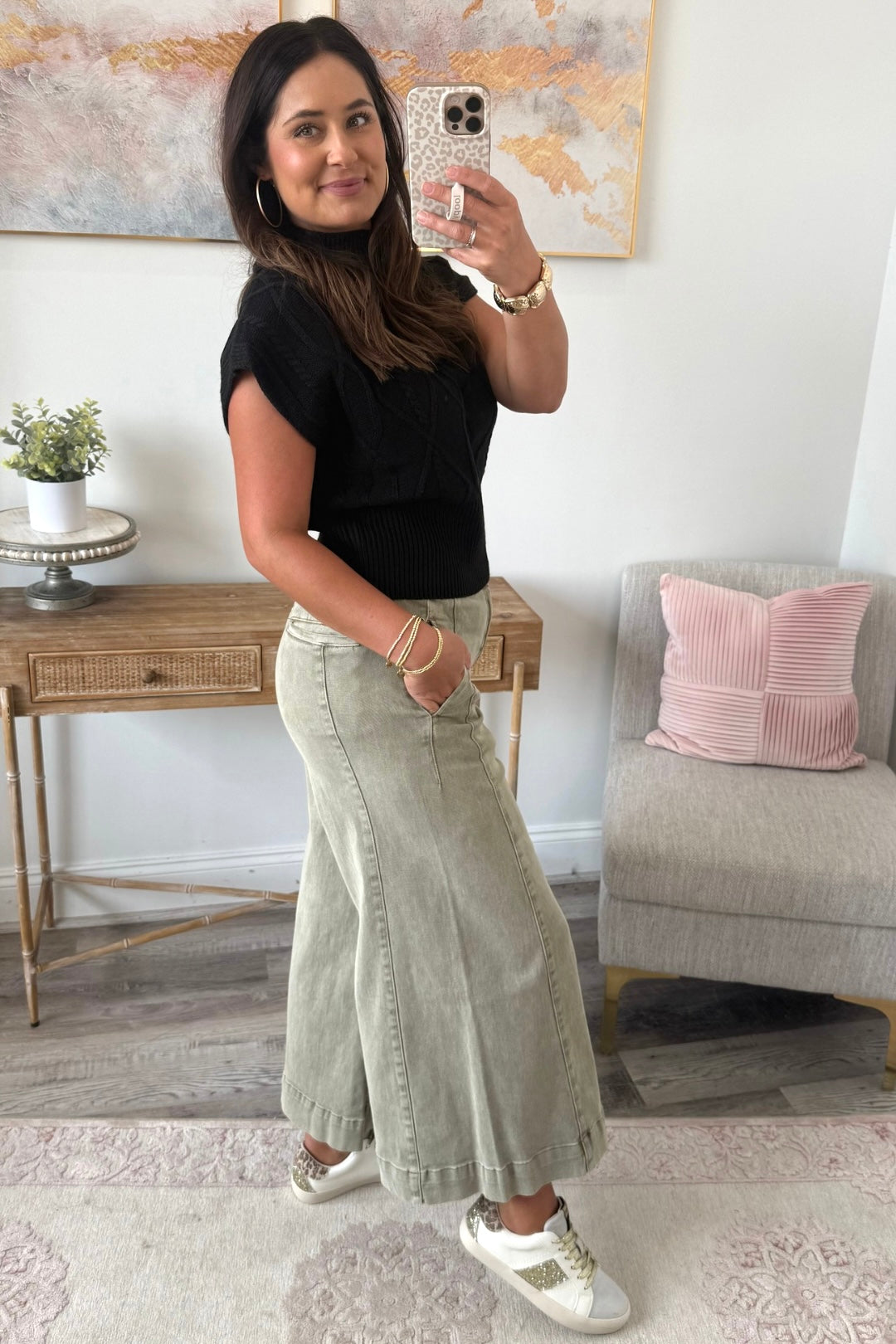 These High Rise, wide leg, and effortlessly chic. A modern wardrobe must have. They have a relaxed washed look to them,, and the pockets just bring it all togther. We think these pants work best for women 5'7 and under.